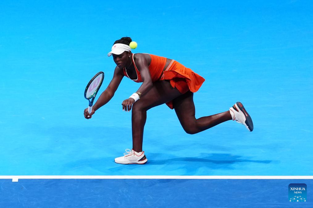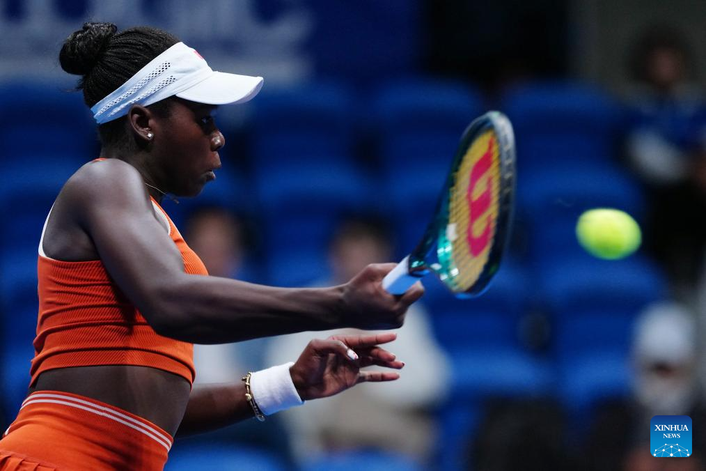 Victoria Mboko of Canada hits a return during the women’s singles quarterfinal match between Elena Rybakina of Kazakhstan and Victoria Mboko of Canada at the Pan Pacific Open tennis tournament in Tokyo on Oct. 24, 2025. (Xinhua/Jia Haocheng)
