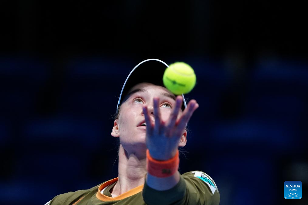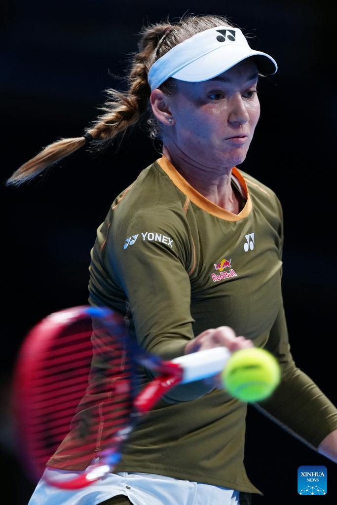 Elena Rybakina of Kazakhstan hits a return during the women’s singles quarterfinal match between Elena Rybakina of Kazakhstan and Victoria Mboko of Canada at the Pan Pacific Open tennis tournament in Tokyo on Oct. 24, 2025. (Xinhua/Jia Haocheng)