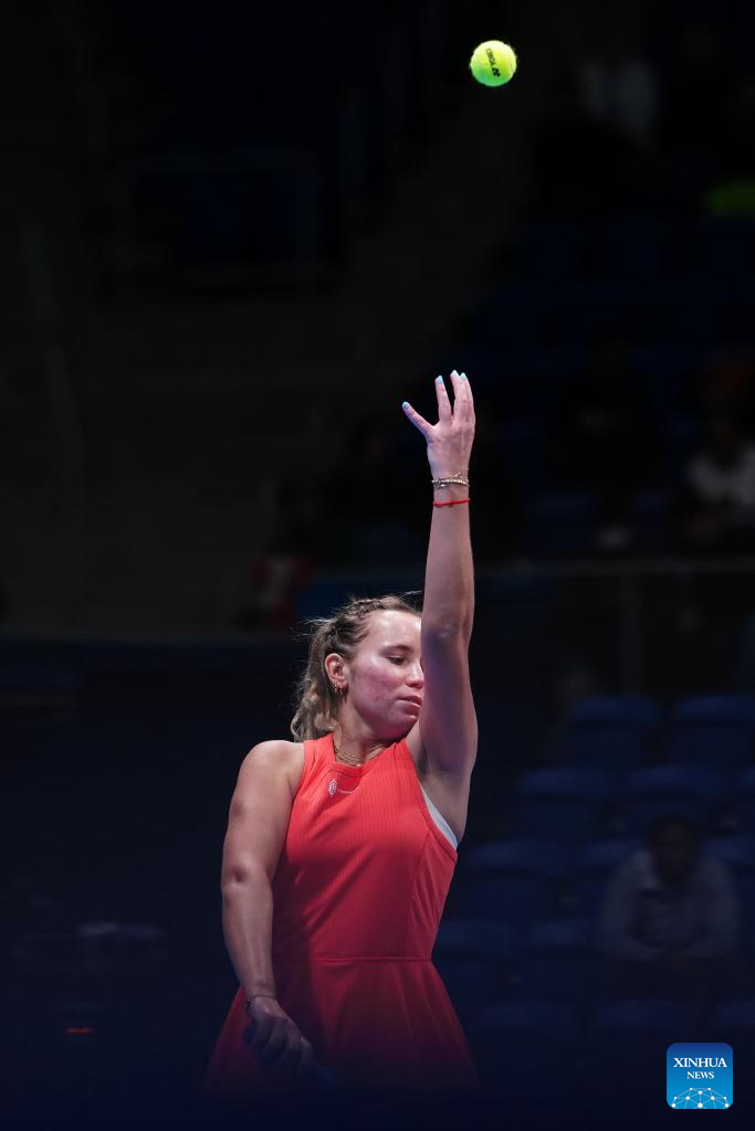 Ekaterina Alexandrova serves during the women’s singles quarterfinal match between Sofia Kenin of the United States and Ekaterina Alexandrova of Russia at the Pan Pacific Open tennis tournament in Tokyo, Japan, on Oct. 24, 2025. (Xinhua/Jia Haocheng)