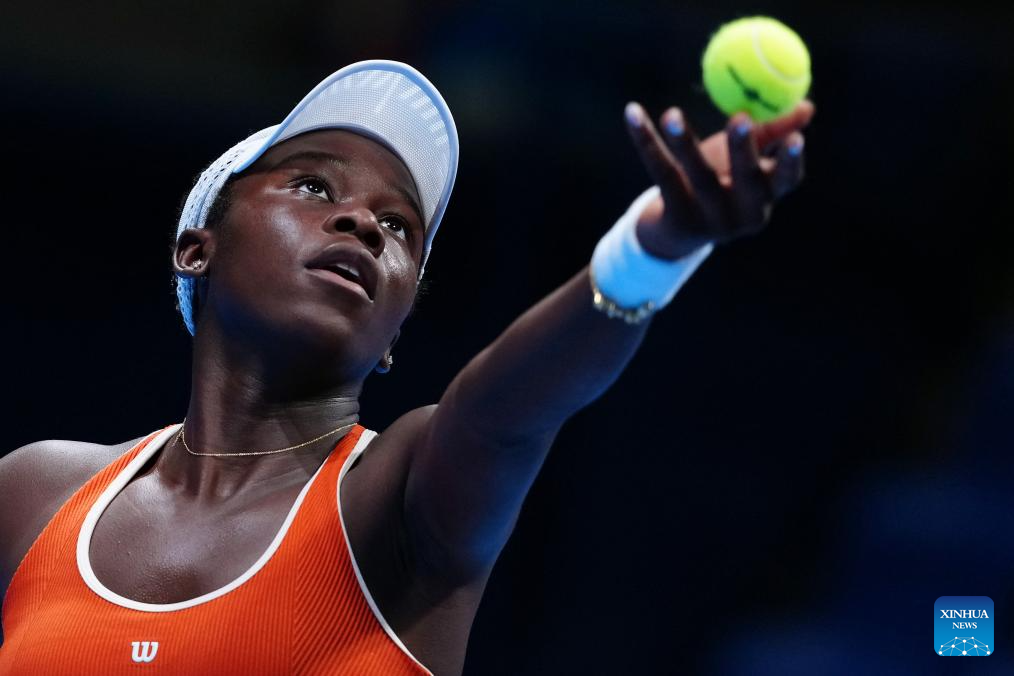Victoria Mboko of Canada serves during the women’s singles quarterfinal match between Elena Rybakina of Kazakhstan and Victoria Mboko of Canada at the Pan Pacific Open tennis tournament in Tokyo on Oct. 24, 2025. (Xinhua/Jia Haocheng)