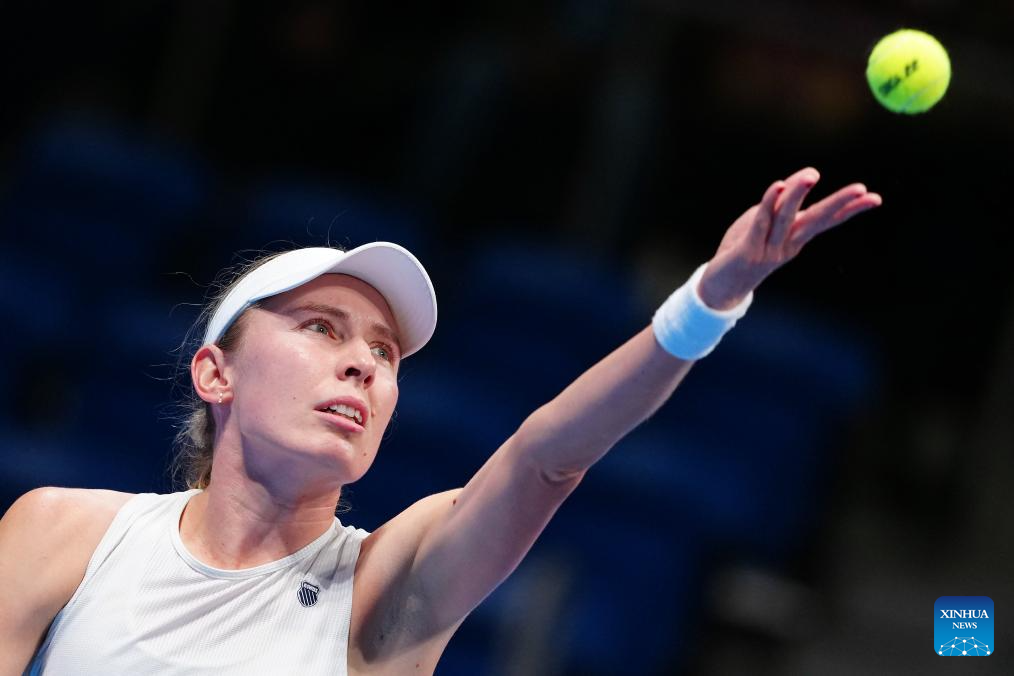 Ekaterina Alexandrova hits a return during the women’s singles quarterfinal match between Sofia Kenin of the United States and Ekaterina Alexandrova of Russia at the Pan Pacific Open tennis tournament in Tokyo, Japan, on Oct. 24, 2025. (Xinhua/Jia Haocheng)
