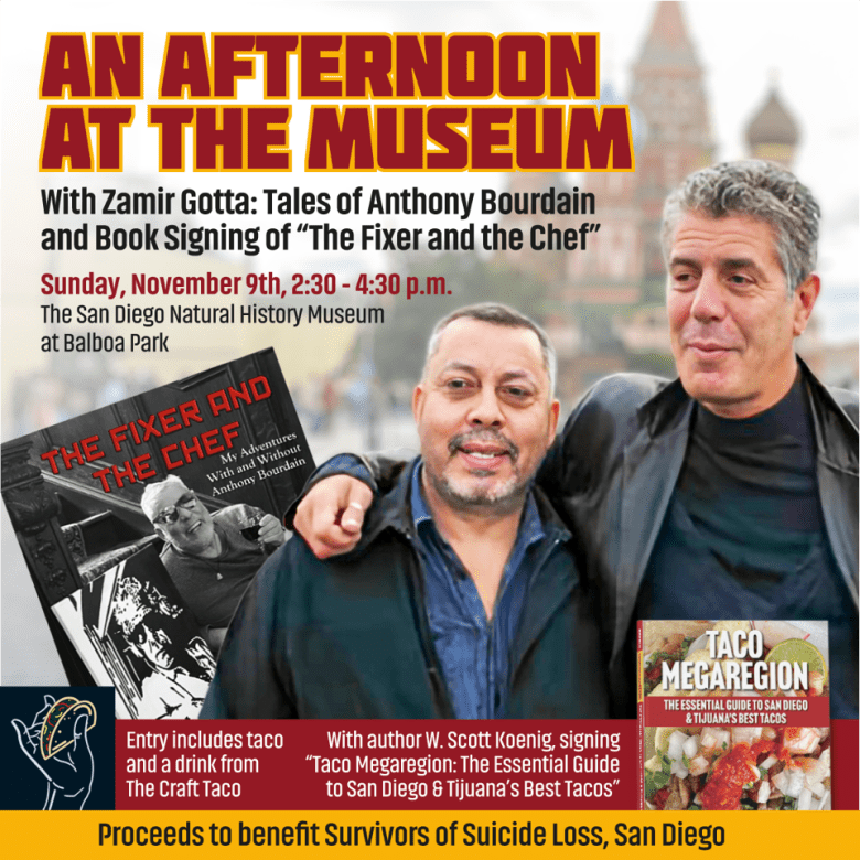 Fans of the late Anthony Bourdain can feed their wanderlust and their appetite at An Afternoon at the Museum, happening Sunday, Nov. 9, 2:30 to 4:30 p.m. at the San Diego Natural History Museum. Bourdain’s longtime travel companion and fixer, Zamir Gotta, shares behind-the-scenes stories from No Reservations and Parts Unknown and signs his new book, The Fixer and the Chef: My Life With and Without Anthony Bourdain. He’s joined by W. Scott Koenig (Taco Megaregion), who dives into the San Diego–Tijuana taco scene. Guests can snack on tacos from The Craft Taco (named one of Yelp’s Top 100 Taquerias in the U.S.), sip non-alcoholic drinks, and enjoy a Q&A with both authors. Proceeds benefit Survivors of Suicide Loss San Diego. Tickets ($30–$75): zamir-gotta.eventbrite.com.