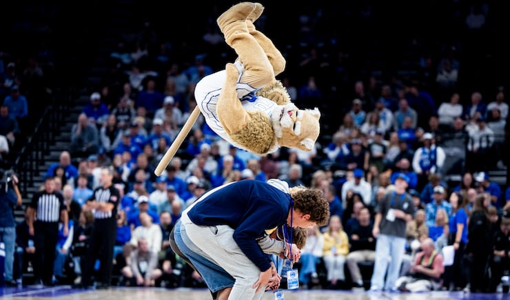 Cosmo the Cougar flips over fans during an NCAA men’s basketball exhibition game between BYU and North Carolina held at the Delta Center in Salt Lake City on Friday, Oct. 24, 2025. | Isaac Hale, Deseret News