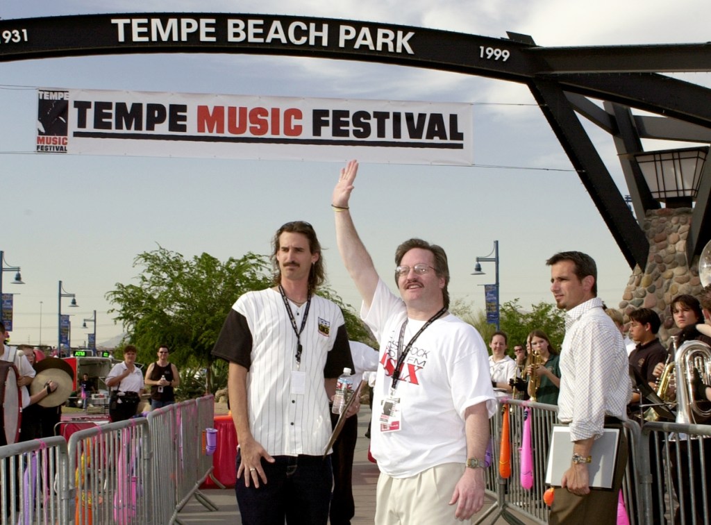 Former KDKB deejay Pete Cummings, center, with former KSLX deejay Evan Oh, center-right, and former Tempe Mayor Neil Giuliano, far right, kicking off the first Tempe Music festival in 2003.
