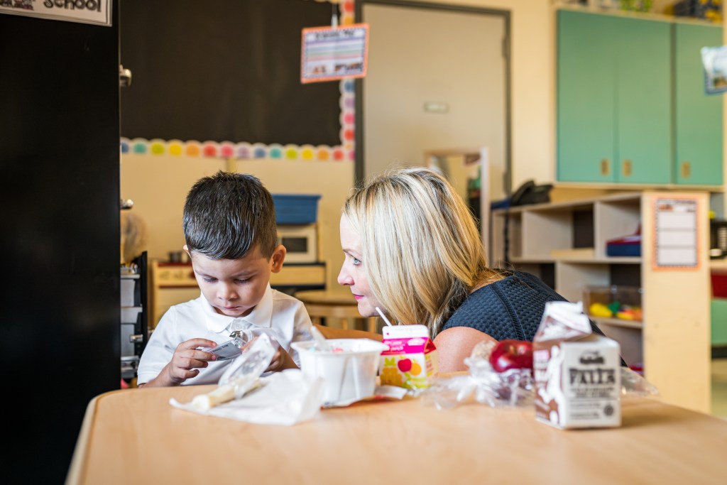 Mayor Mattie Parker talks to a pre-K student on the first day of school at Fort Worth ISD’s T.A. Sims Elementary on Aug. 14, 2023. (File photo | Fort Worth Report)