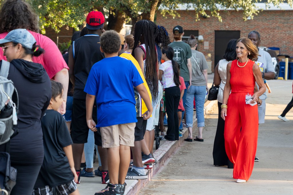 Fort Worth ISD Superintendent Karen Molinar greets families in line for the Tarrant County Back to School Roundup on Aug. 8, 2025, at Tarrant County College’s South Campus in Fort Worth. (Mary Abby Goss | Fort Worth Report)