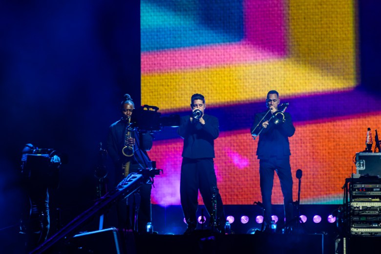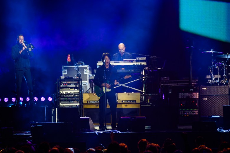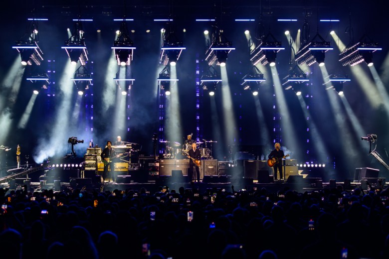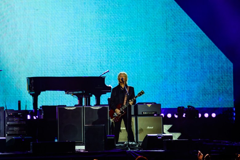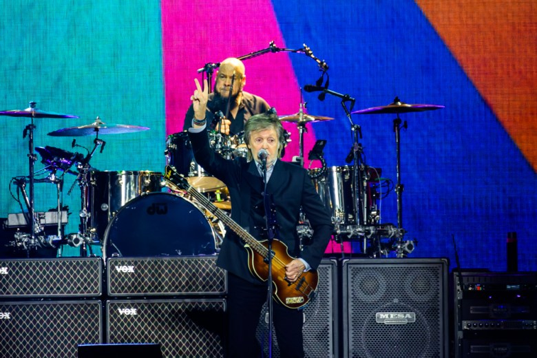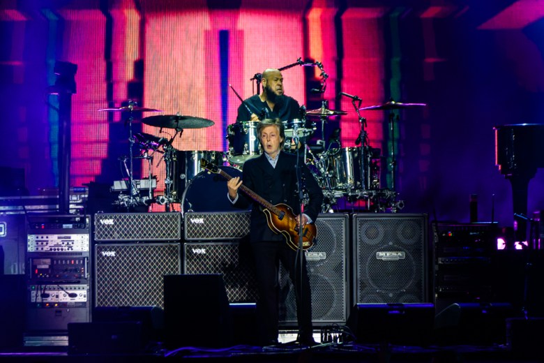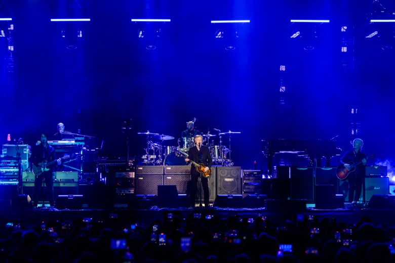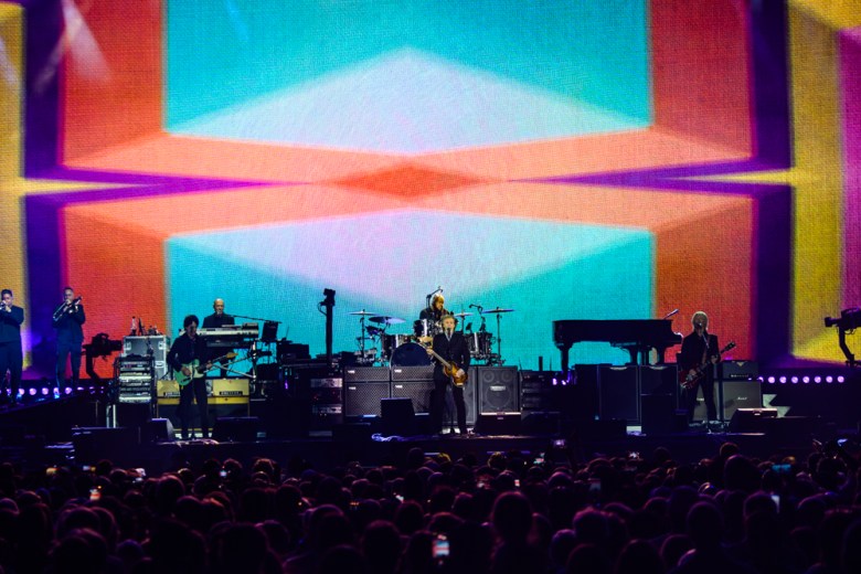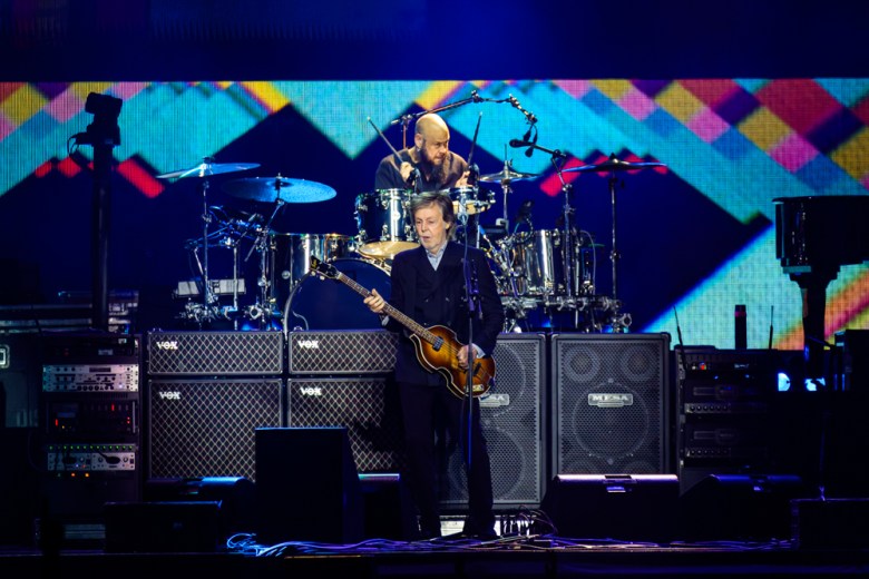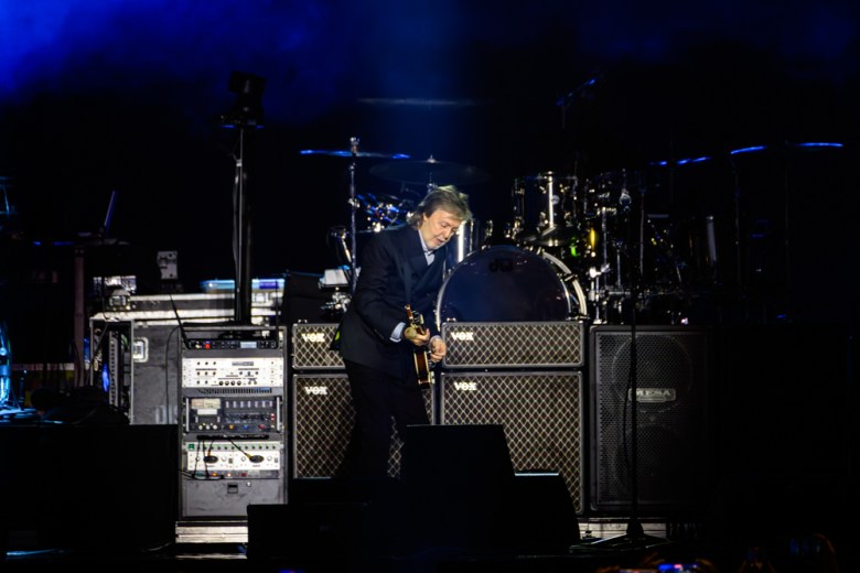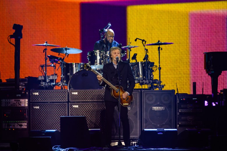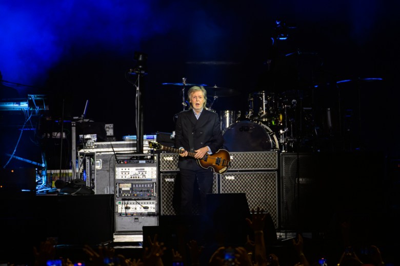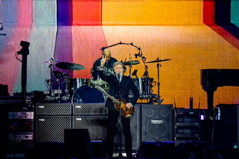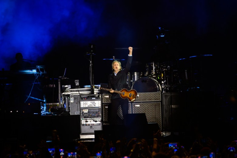 The show was a masterclass in dynamics. During a high point, thundering pyrotechnics and fireworks matched the drama of the Wings epic “Live and Let Die.” Yet the crowd was equally awed by the hushed, intimate moment when McCartney played the Beatles’ “Blackbird” alone with his acoustic guitar as the platform on which he stood lifted up from the stage.