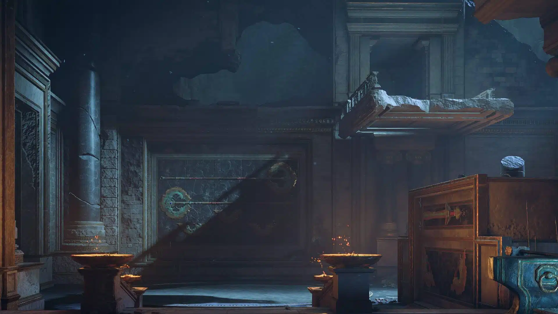 Another interesting thing to note is the clear Greek-inspired architecture evident in the buildings. But some environments look like they were plucked from God of War 2018 and Ragnarok. There appears to be a female statue holding a mask, which reminded us of the statues in the original God of War games, though we aren’t sure whether a god is associated with wearing a mask. Then there’s what appears to be statues of possibly soldiers, holding a shield and spear, something that would associate with Spartans. But their appearance also comes off as that of the Einherjar, the Norse warriors who reside in Valhalla in God of War Ragnarok. You can also see several weapons on display that have a hint of green, which reminds us a little of the weapons the Beserkers and other enemies used in 2018 and Ragnarok.