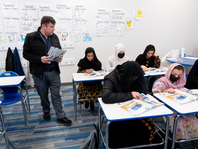 Ismail Ja Khosti teaches English as a Second Language (ESL) at Compass Rose Dream in January 2024. Credit: Brenda Bazán / San Antonio Report