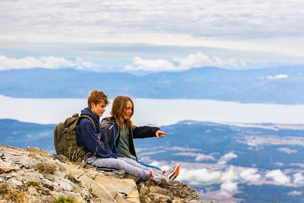 Students Who Exercise Together (SWET) participants Ranger Hafer and Matthias Ek take in the view from the summit of Mount Aeneas during a field trip that included hiking to Picnic Lakes on Friday, Oct. 3, 2025. (Photo by Noah Couser Photography)
