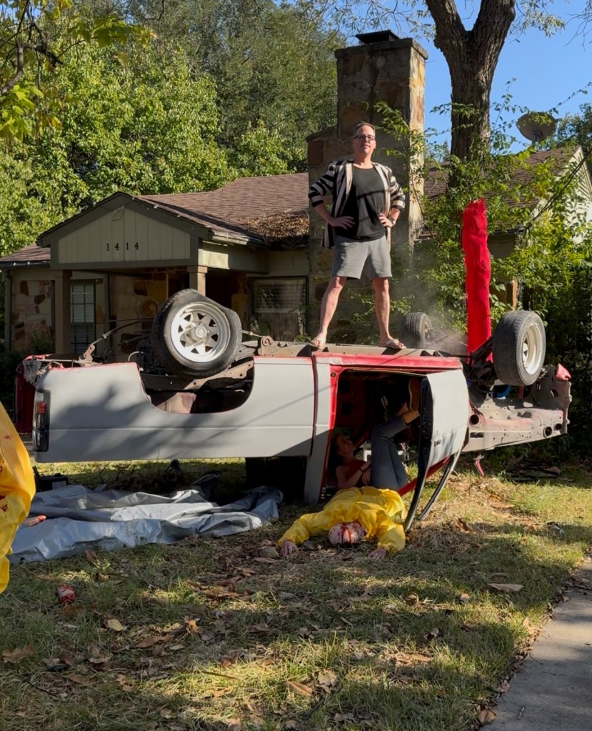 Rose Cobey, the partner in question, is also a little queasy about blood, so Novak has pivoted further in recent years to more conceptual stories, using self-built animatronics and props. In this case, the crashed helicopter transformed into an upside-down truck, and he wrote a back story about zombies to support it. One video previewing this year’s setup already has more than a million views.