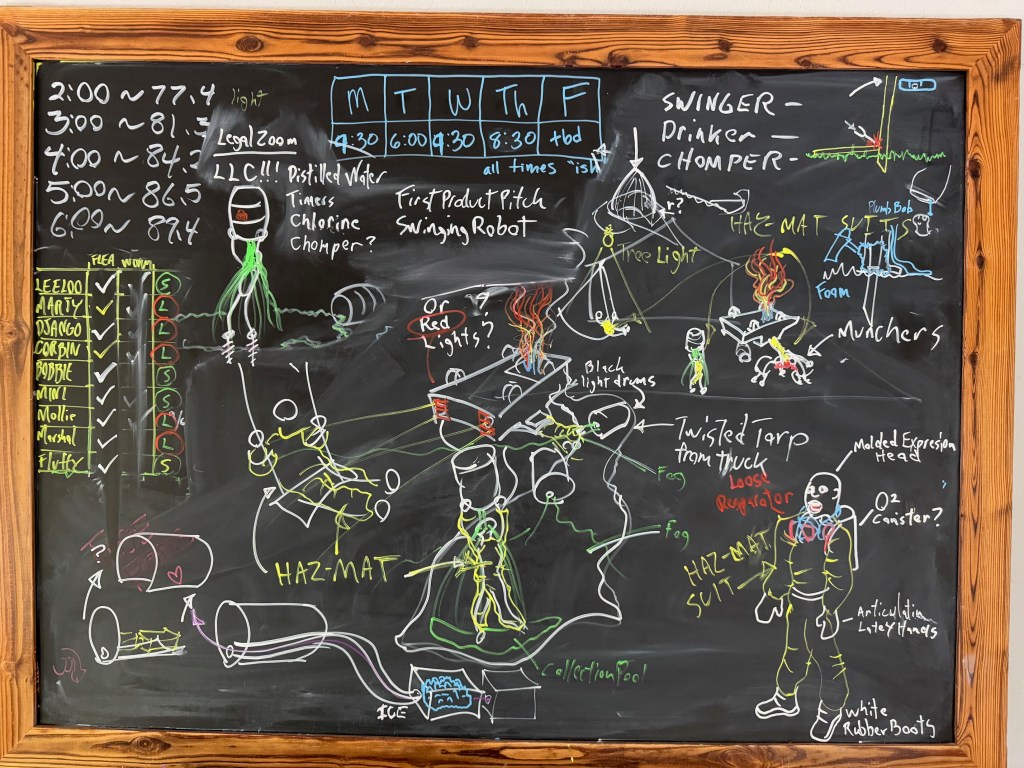 Novak named this year’s figures “Larry, Moe and Curly” after the classic comedy trio from The Three Stooges. He sketched out the scene four months ago on a chalkboard, then refined it through page after page of drawings before moving the ideas into a 3D rendering program called Blender. Once Novak works out each figure’s dimensions, he fine-tunes the builds and decides what materials he can use to transform his dreams into reality. And, he says, “Once I decide how to get my head around the material, I’m unstoppable.”