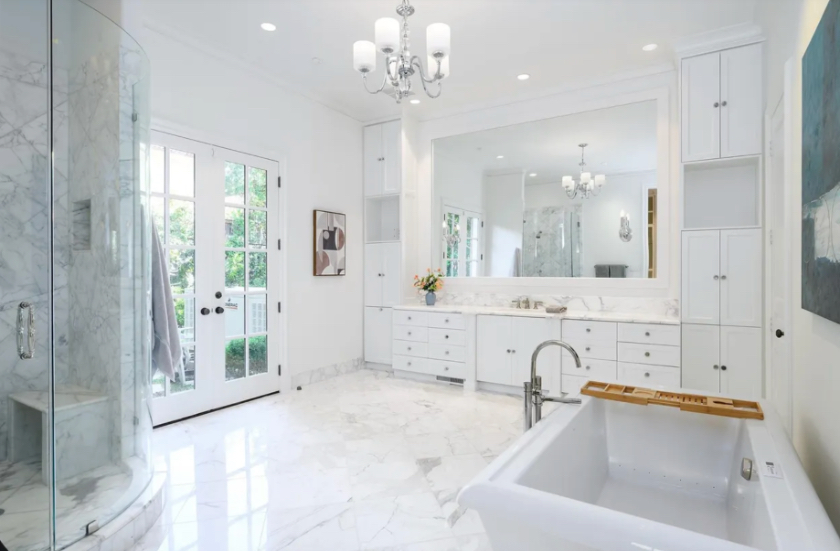 Lemmons brought in a big drywall team to smooth the heavily troweled walls to a Level 5 museum finish. That made an enormous difference, but the most profound transformation was the floors. We’ve all seen red oak parquet lattice-pattern entry floors. They were all the rage in the early 2000s, but that look no longer resonates with buyers in 2025. Who knew you could bleach them? Well, Vanderford and Lemmons did.