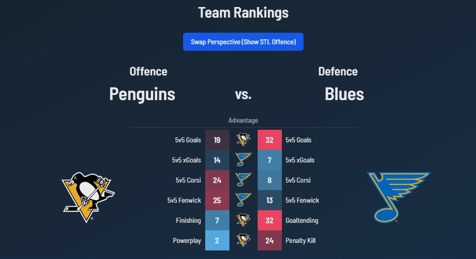 The Pens have gotten some great goaltending lately and been heavily out-shot in recent games, but the stats say that St. Louis should be an opponent they can step up against. The Blues have had a ton of trouble keeping the puck out of their own net.