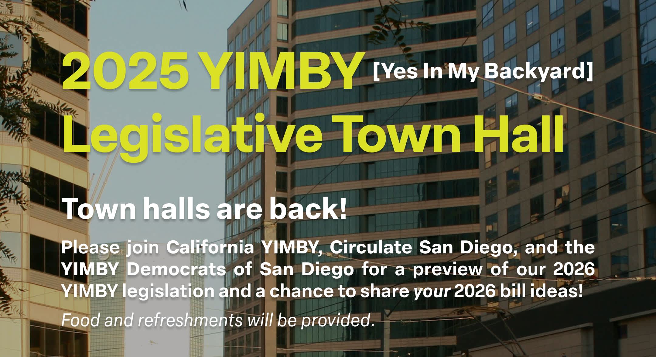 In November, we are partnering with statewide and local YIMBY organizations for the 2025 YIMBY Legislative Town Hall. The YIMBY Movement took huge strides toward making California housing more affordable and abundant this year – and YOU helped make it happen.