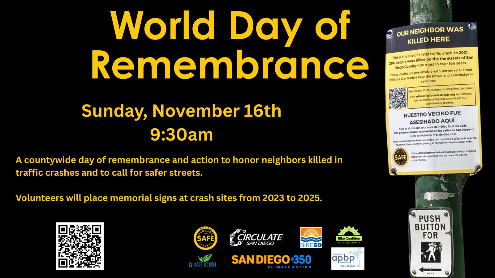 Join Families for Safe Streets San Diego and safe streets advocates for the World Day of Remembrance for Road Traffic Victims on November 16th. This is a global day to honor the 1.35 million people killed each year in preventable traffic crashes and to push for change.