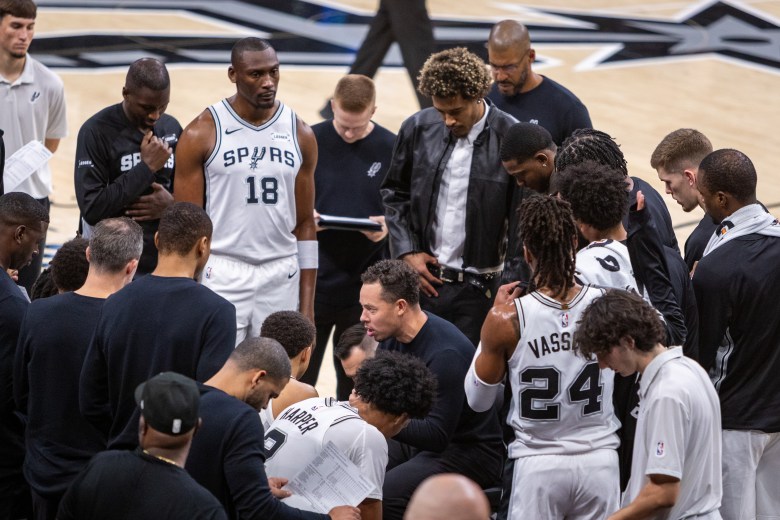 Spurs Head Coach Mitch Johnson (center) speaks with his team during a timeout at the Spurs v Nets game at the Frost Bank Center on Oct. 26, 2025. Credit: Blaine Young for the San Antonio Report