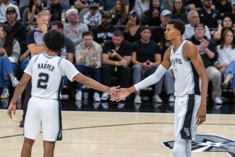 Spurs players Dylan Harper (left) and Victor Wembanyama high-five during the Spurs v Nets game at the Frost Bank Center on Oct. 26, 2025. Credit: Blaine Young for the San Antonio Report