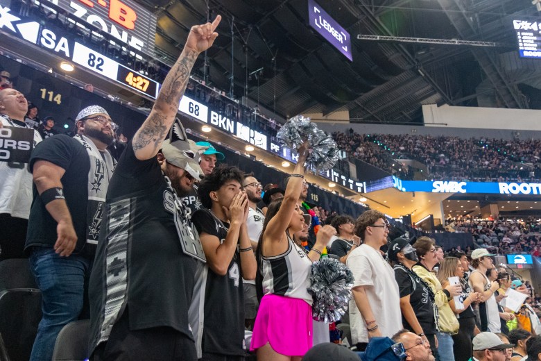 Spurs fans cheer in the stands during the Spurs v Nets game at the Frost Bank Center on Oct. 26, 2025. Credit: Blaine Young for the San Antonio Report