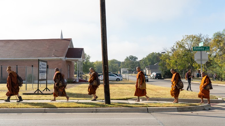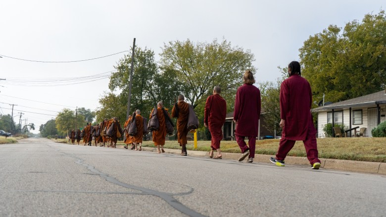 Buddhist monks from Fort Worth’s Huong Dao Vipassana Bhavana Center begin their Walk for Peace initiative Oct. 26, 2025. (Marissa Greene | Fort Worth Report)