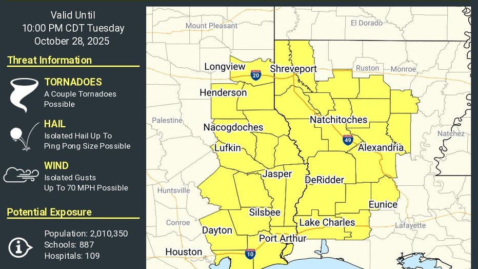 Polk, Chambers, and Liberty Counties are included in a Tornado Watch for parts of Texas and Louisiana, according to the National Weather Service.