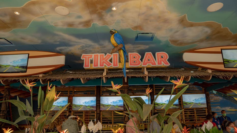 Tiki bar signage at the Margaritaville Resort Times Square during the opening in New York, U.S., on Thursday, June 10, 2021. The 32-story urban resort features 234 guest rooms and suites, five original restaurant and bar concepts, and access to a yea