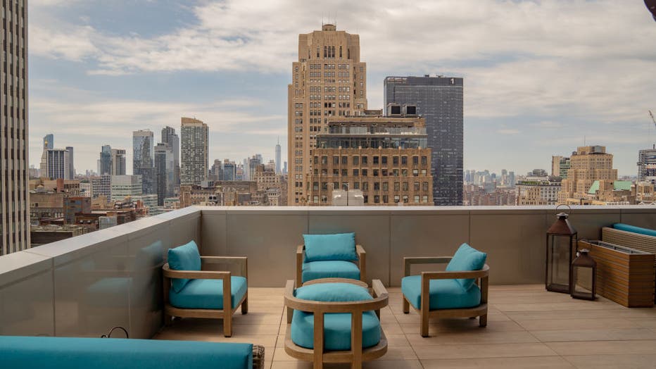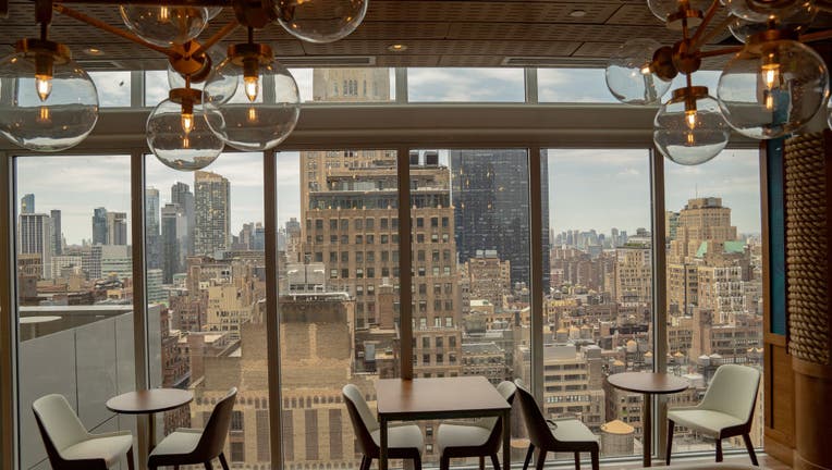 The rooftop lounge on the 32nd floor at the Margaritaville Resort Times Square during the opening in New York, U.S., on Thursday, June 10, 2021. The 32-story urban resort features 234 guest rooms and suites, five original restaurant and bar concepts,