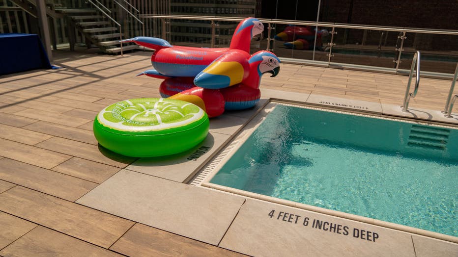 Inflatable floats on the rooftop pool at the Margaritaville Resort Times Square during the opening in New York, U.S., on Thursday, June 10, 2021. The 32-story urban resort features 234 guest rooms and suites, five original restaurant and bar concepts
