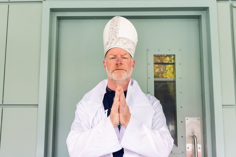 For the costume, go deep in your clothes drawer or find a rubber container in your basement that has clothes from a decade ago, when Villanova was an NCAA title contender, and grab that old T-shirt. (Alternate, find a Rally House or Dick’s.) A white smock or old housecoat can be turned into the cassock, and a 5-foot-long piece of white fabric that’s about a foot wide can serve as the fascia, which is the sash. The cassock and fascia need to be white. Editor Kevin Donahue used posterboard, a gold marker and tape to make the hat.