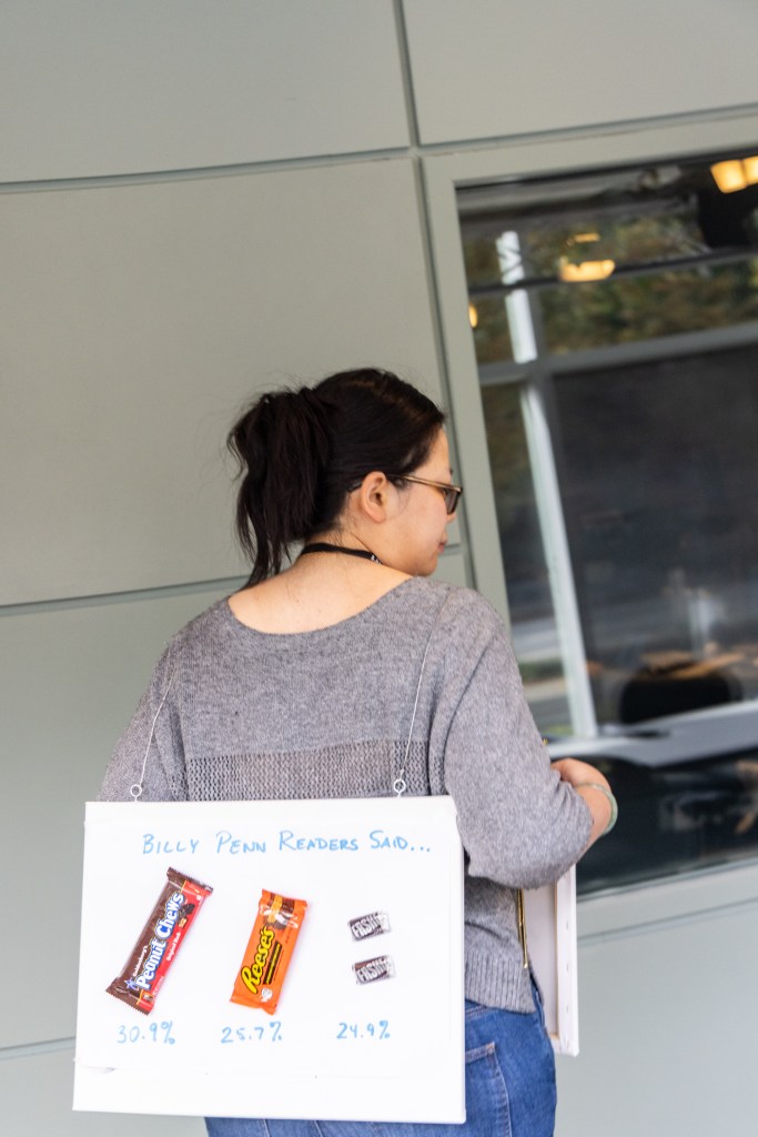 Billy Penn deputy editor Heather Chin did this using two blank canvases from last year’s Halloween guide — a sandwich board or card will also work — and used wire to connect them with arm straps, and also attach a marker. On one canvas, she taped a paper with the state candy poll options written out, leaving room for people to add tally marks. On the other canvas the sweet treats list on the poll were stuck on.