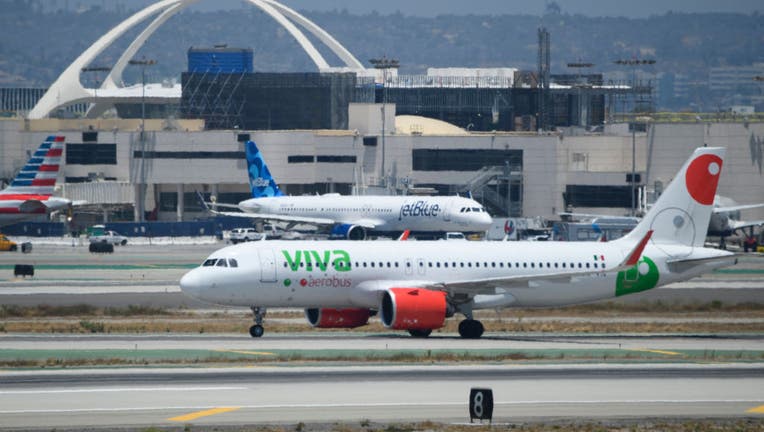 A Viva Aerobus Airbus SE A320 flight arrives from Mexico as a JetBlue aircraft stands on the tarmac at Los Angeles International Airport (LAX) on July 6, 2021. (Photo by PATRICK T. FALLON/AFP via Getty Images)