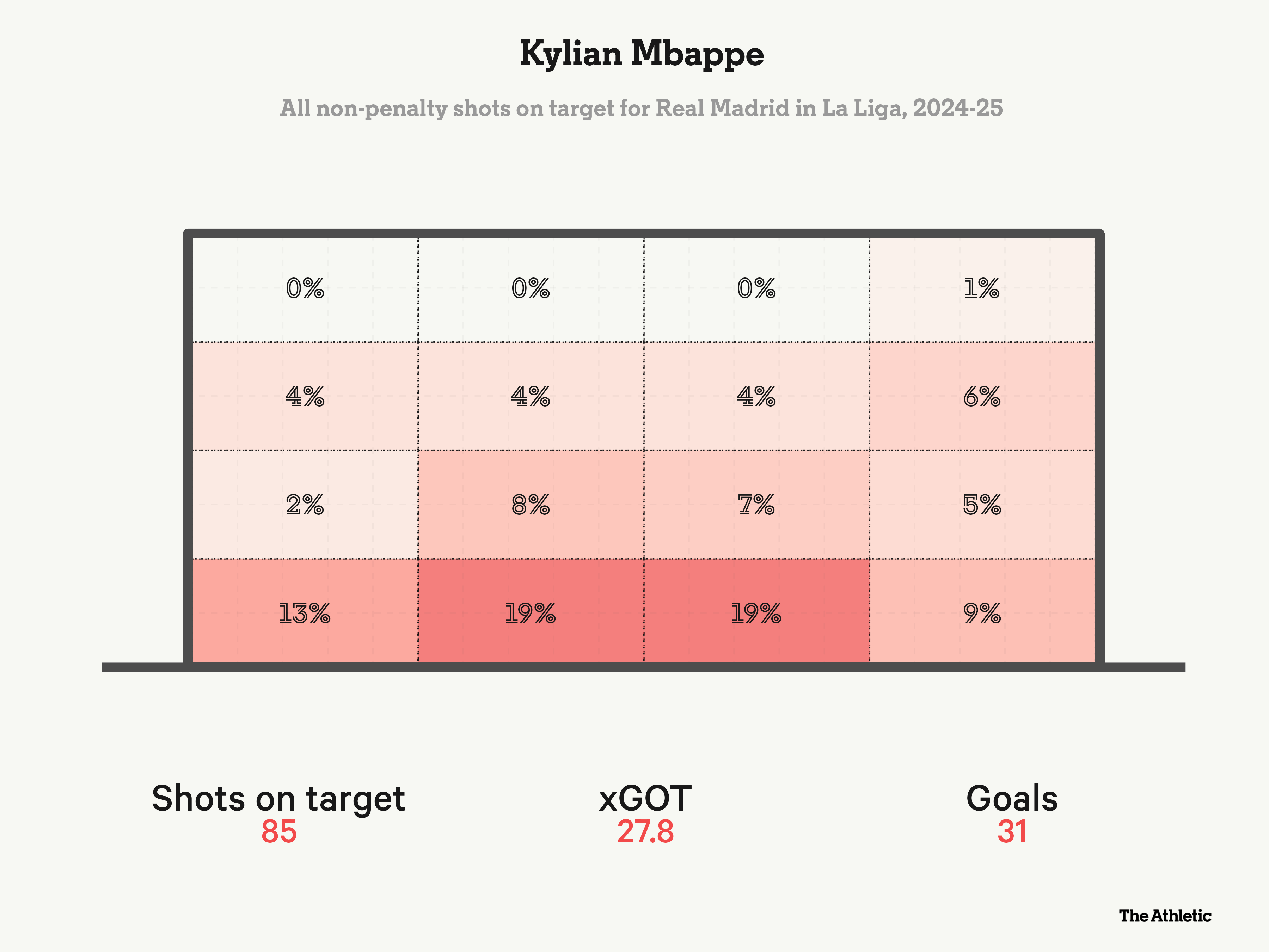 His performances have been spectacular; scoring 16 times and assisting twice, he has been involved in a goal every 63.4 minutes of game time. His xG per shot has risen marginally from 0.16 to 0.18 this season, suggesting he’s been getting into slightly more dangerous areas for his shots this time around. As we can see from the shot maps below, Mbappe has aimed for the bottom-left corner often so far this season, a trademark finish that is driving his fine performance in front of goal.