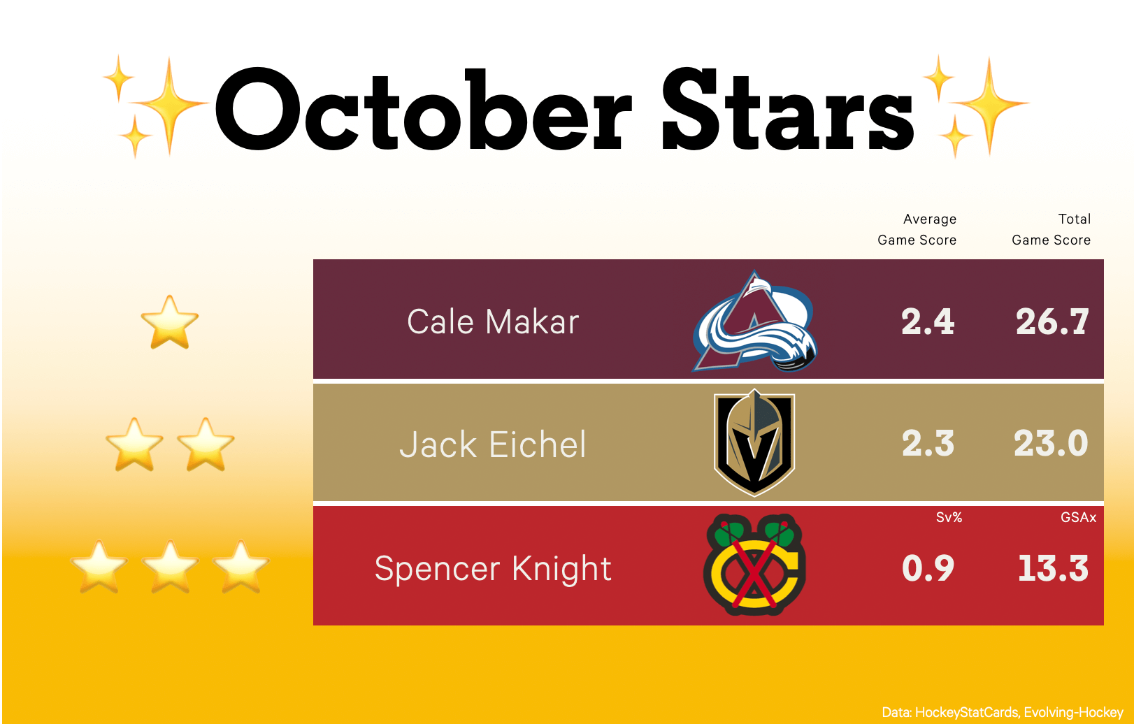 Spencer Knight’s excellent start in Chicago earned him the third star of the month. Despite facing one of the toughest workloads against, he has given the Blackhawks a chance in six of seven starts so far. Along with a sparkling .930 save percentage, Knight leads the league with 13.3 goals saved above expected.