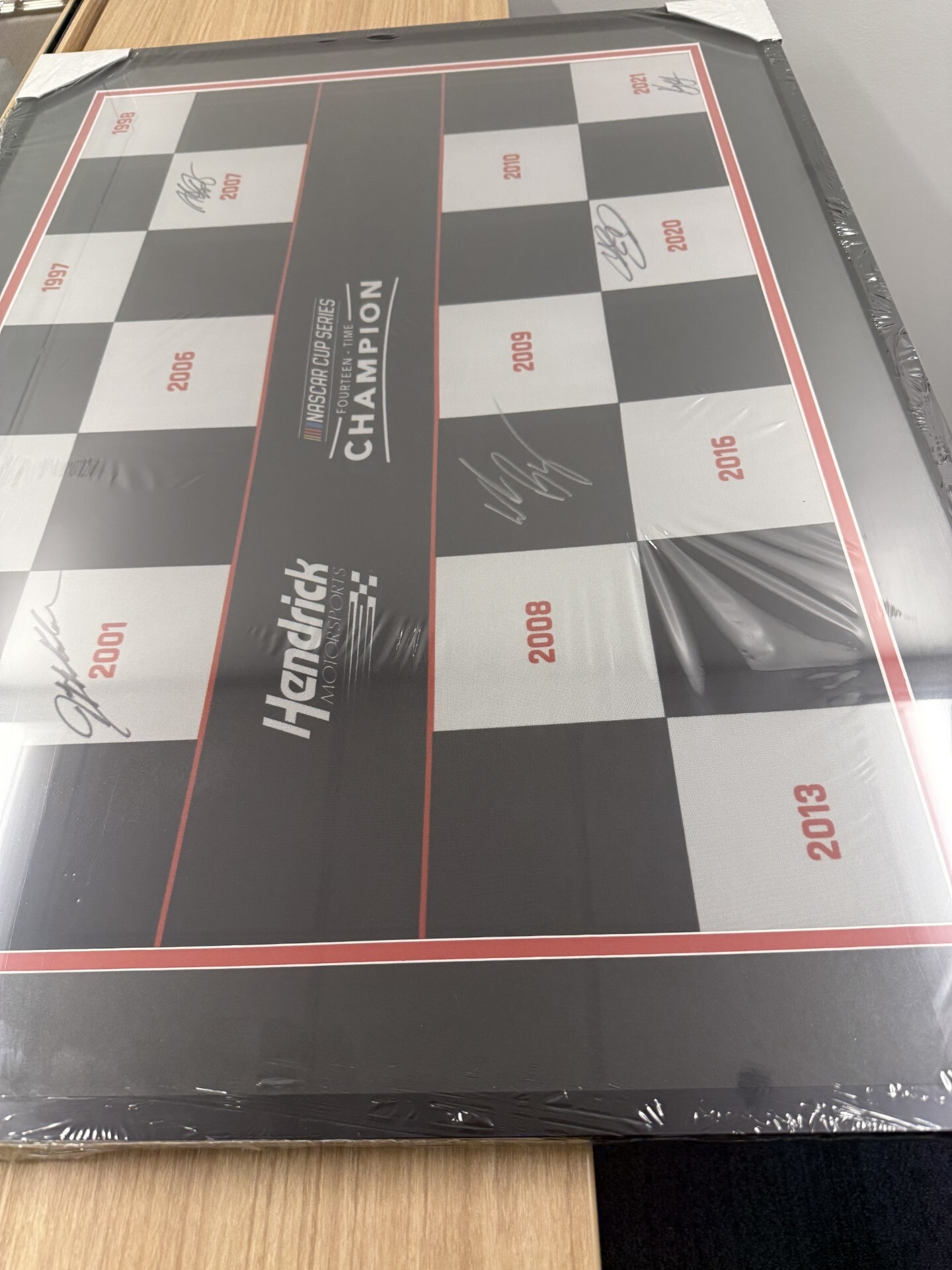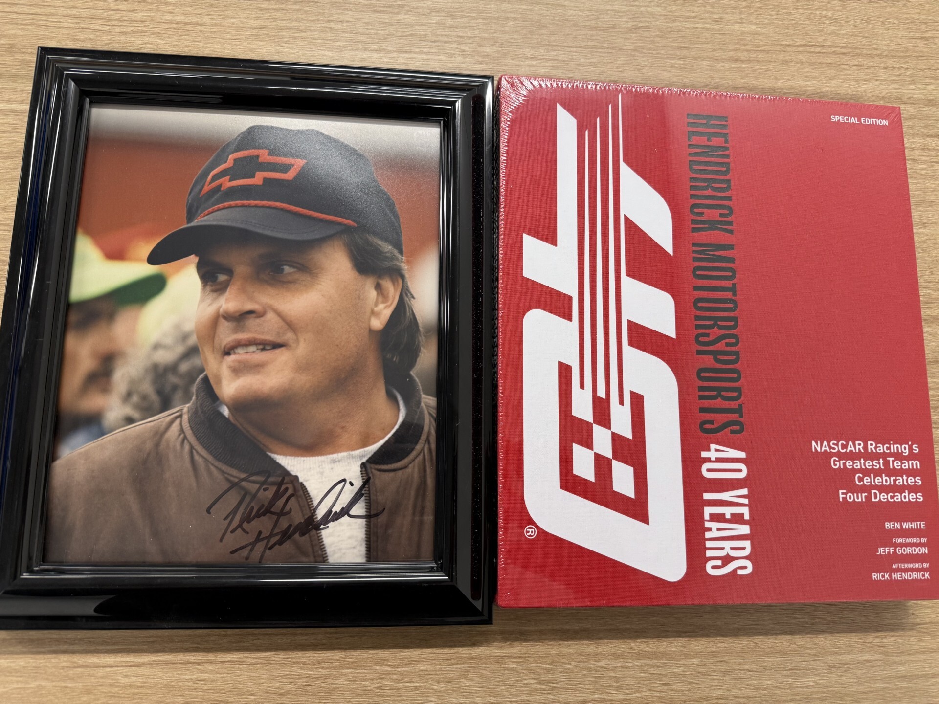 But that’s the tip of the iceberg. Also in the mix is a framed photo of Hendrick Motorsports owner, Rick Hendrick, signed by Mr. H himself. For good measure, Sam also threw in a 40th-anniversary hardcover book, an essential for any fan of the organization.