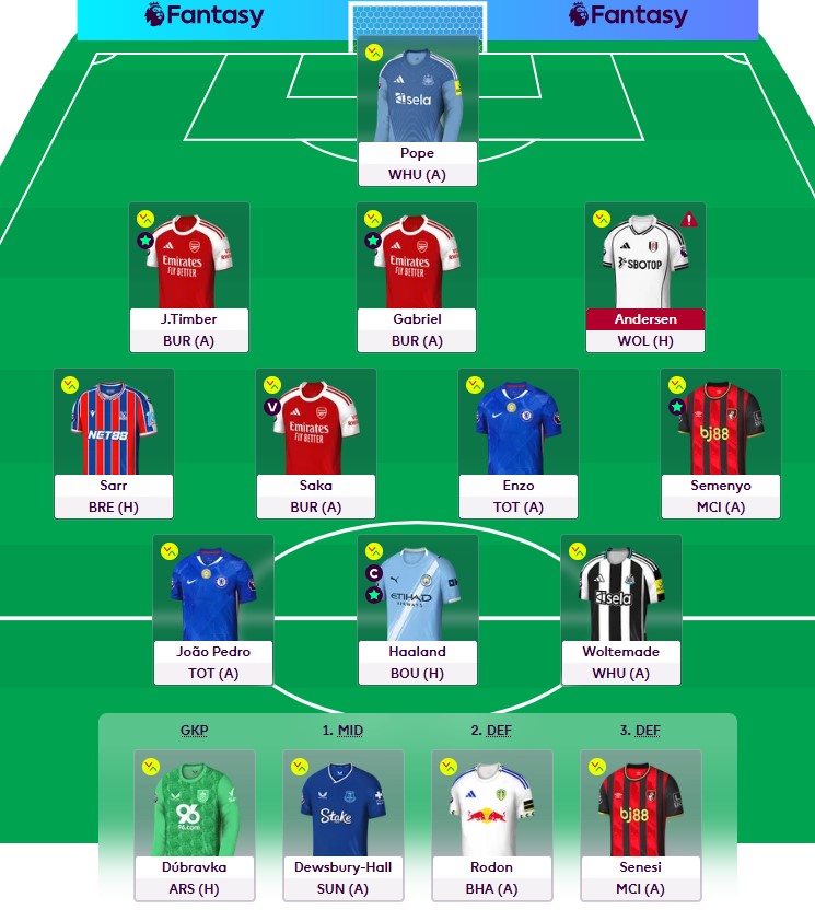 - Pedro down to Eli Kroupi Jr (£4.6m) to upgrade either Kiernan Dewsbury-Hall (£4.9m) to Bryan Mbeumo (£8.2m) or Enzo Fernandez (£6.7m) to Bruno Fernandes (£8.9m)