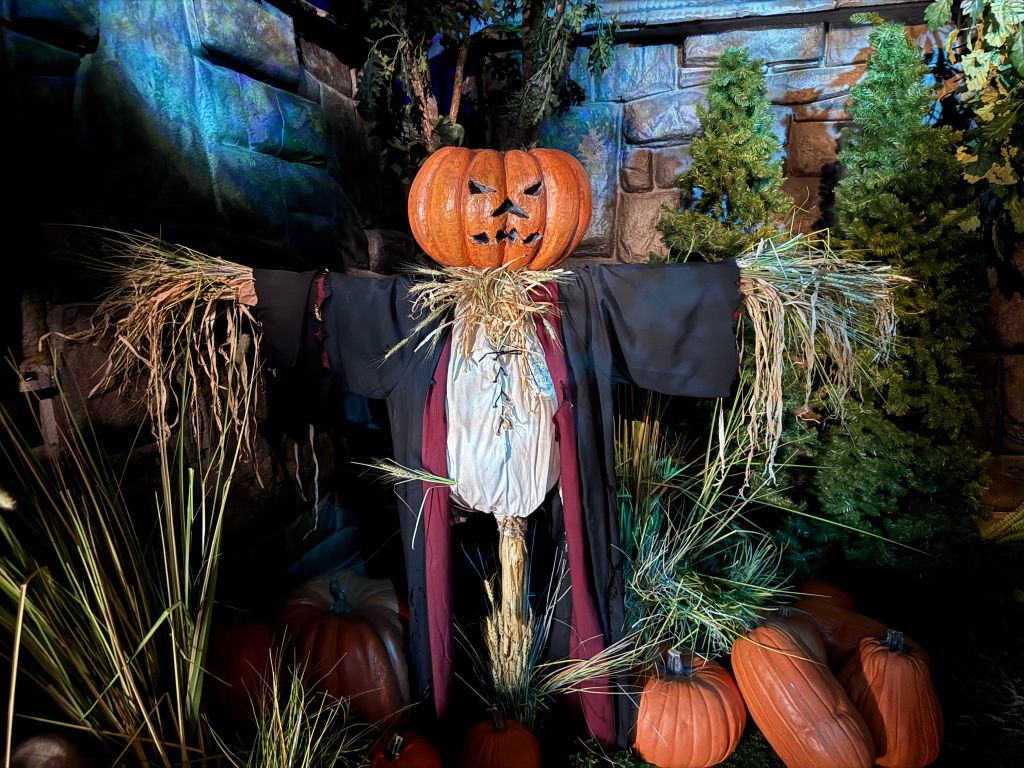 A spooky scarecrow stands guard outside Hagrid’s Hut, bringing a touch of Halloween magic to the Wizarding World.