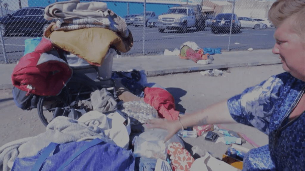 Brandy Baker shows a visitor her belongings outside the Phoenix Key Campus downtown on Oct. 29. (Screenshot by Edward Nieman/Cronkite News)