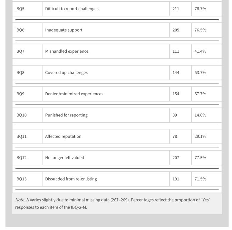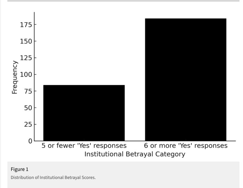 - Demographics like race, gender, and military branch didn’t change the results. This means institutional betrayal is widespread and systemic.