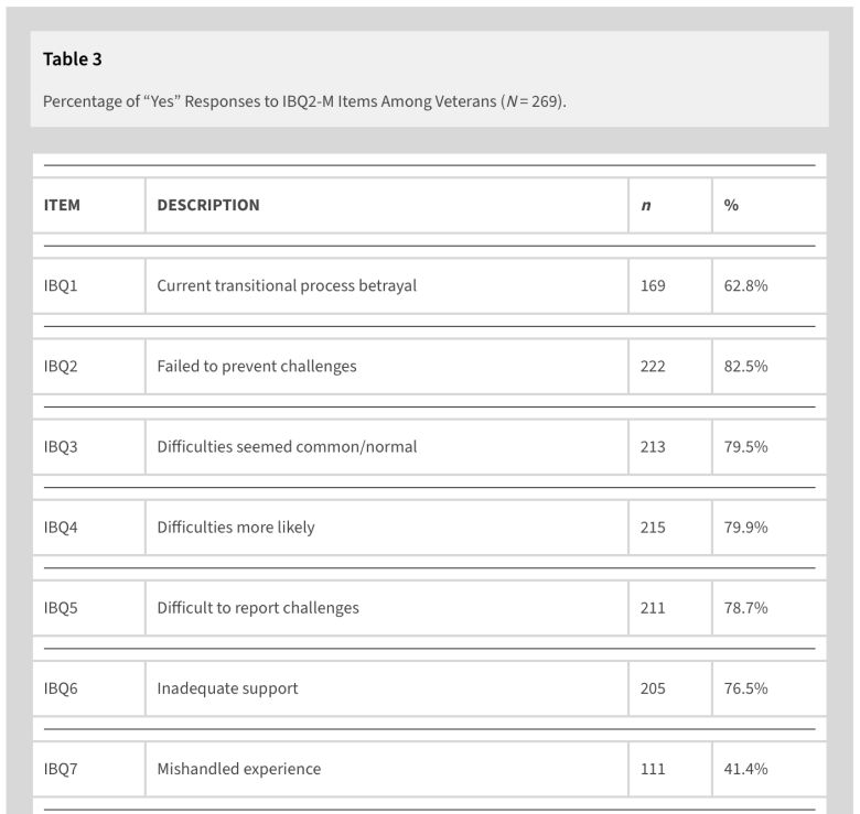 - 79.5% of veterans who felt unprepared for civilian life reported six or more betrayal indicators.