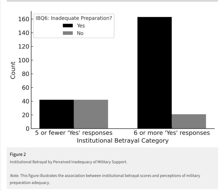 Researchers found that veterans who felt unprepared for civilian life were far more likely to experience deep feelings of betrayal and distrust toward the military institution. Nearly 80% of those who said their transition support was inadequate also reported signs of institutional betrayal.