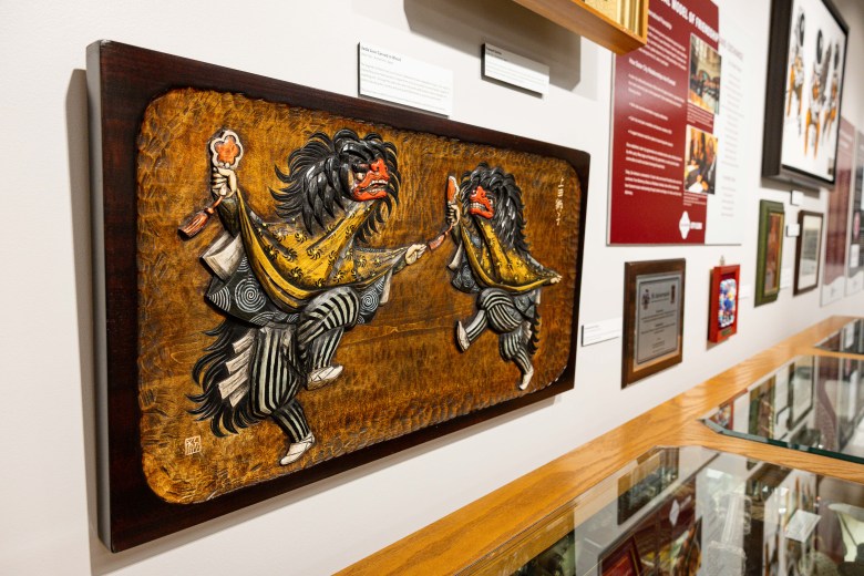 Gifts from San Antonio’s sister cities, like this wood carving of a Ueda Lion Dance from Kumamoto, Japan, are currently on display at the City of San Antonio’s new Municipal Archives Museum. Credit: Amber Esparza / San Antonio Report