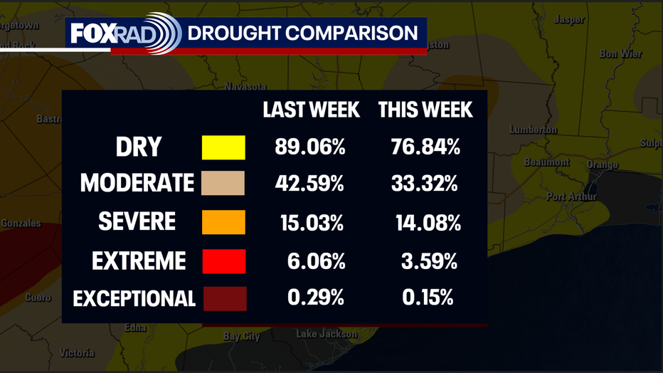 The drought across Texas has actually improved thanks to some much needed rain the state got last weekend. Every drought category noted some sort of improvement this week compared to last week. Unfortunately, 8.5 million Texans still remain in some sort of drought level.