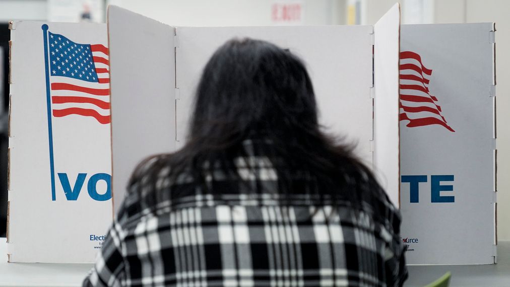 A person marks their ballot at the polling place at Tysons-Pimmit Regional Library in Falls Church, Va. (AP Photo/Stephanie Scarbrough)