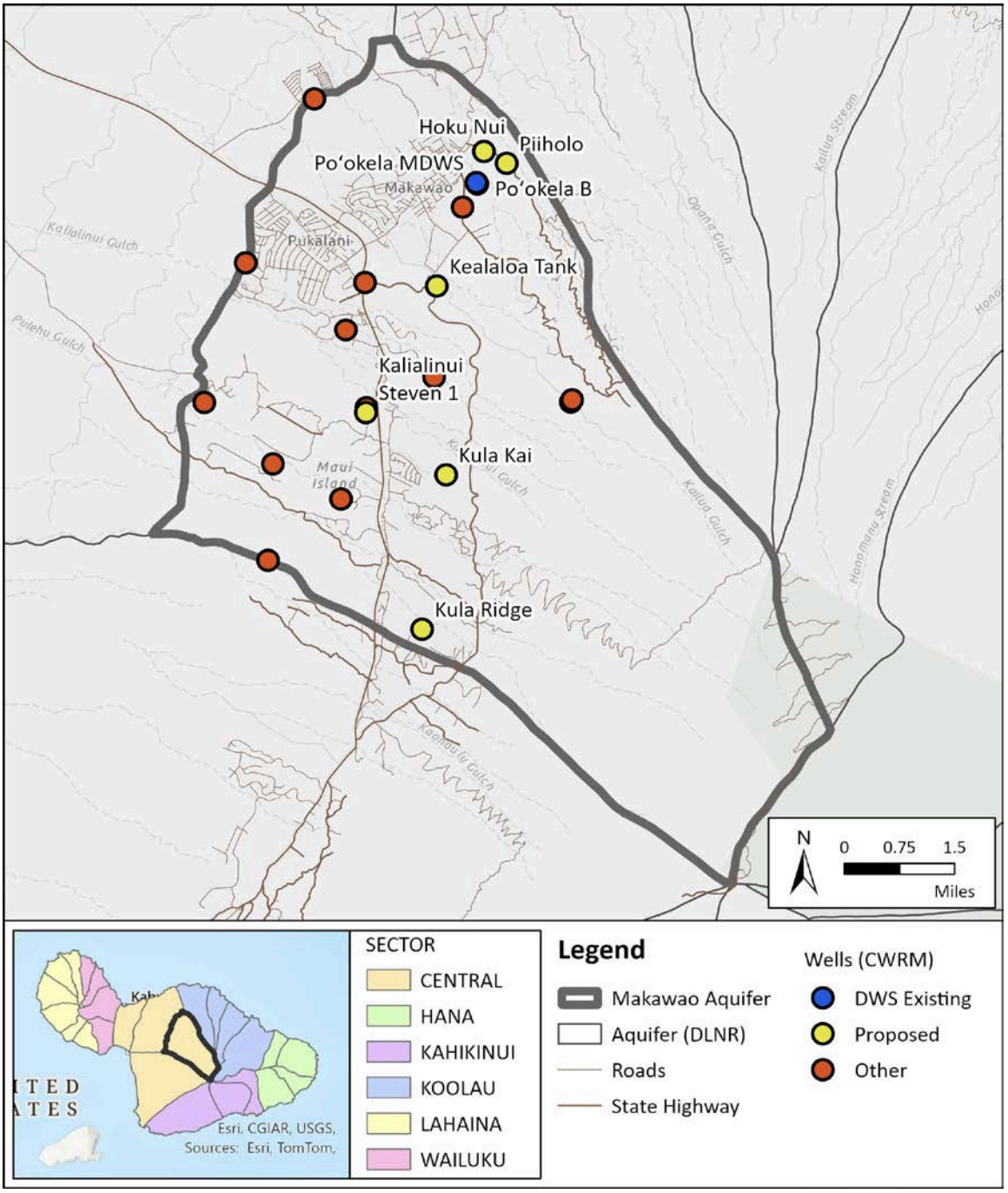 But the solution that the county plans to invest the most in is an increased reliance on wells. The department is considering leasing, purchasing or drilling six wells in the Makawao aquifer, which spans about 229 square miles ranging from the 9,600-foot elevation level near the peak of Haleakalā to 1,100 feet where it transitions to the Pā‘ia aquifer.