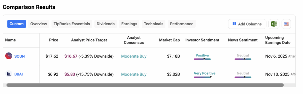 Using TipRanks’ Stock Comparison Tool, we compared SOUN and BBAI to see which small-cap AI stock analysts favor. Both carry a Moderate Buy rating. SOUN stock has a price target of $16.67, implying a downside of 5.4%, while BBAI’s stock price target of $5.83 implies a bigger downside of over 15%.