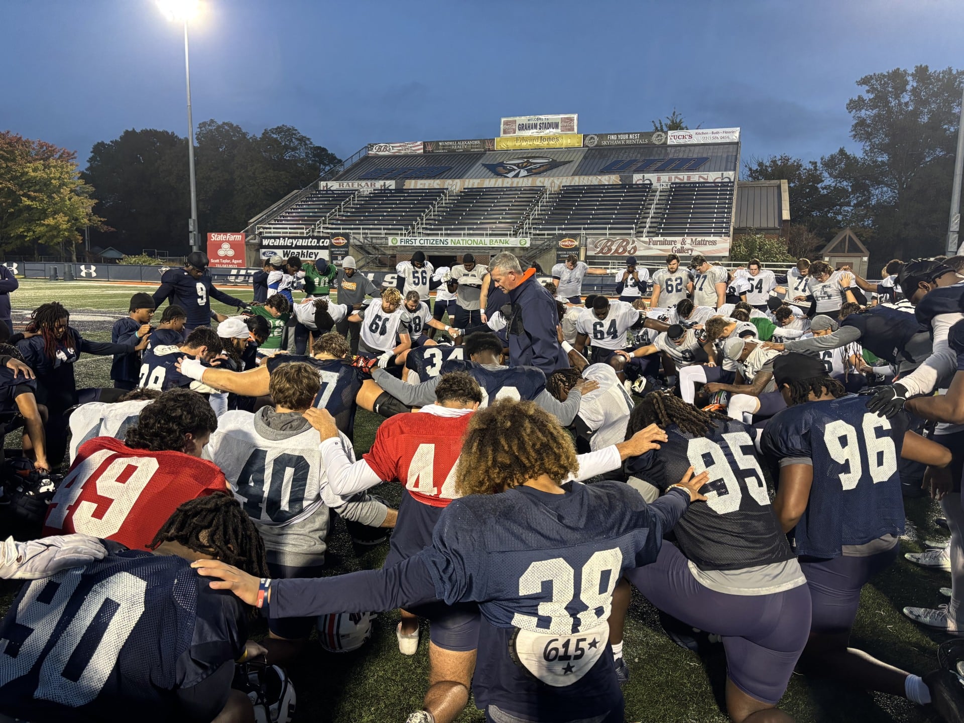 Eyes closed, head bowed, Jason led his players, circled up in the middle of the football field at the close of practice.
