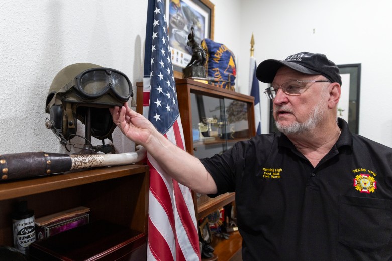 Randall High shows off his helmet in his office at Veterans of Foreign Wars Post 8235 on Aug. 15, 2025, in southwest Fort Worth. (Mary Abby Goss | Fort Worth Report)