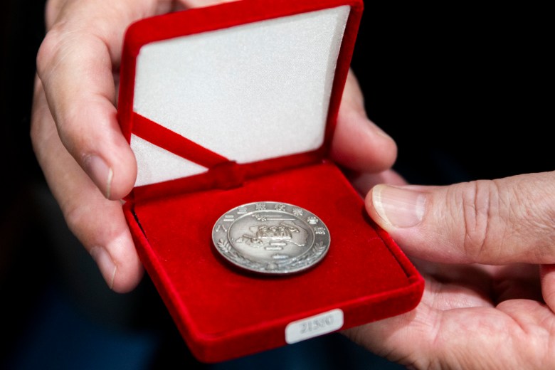 Randall High shows a coin gifted to him in his office at Veterans of Foreign Wars Post 8235 on Aug. 15, 2025, in southwest Fort Worth. (Mary Abby Goss | Fort Worth Report)