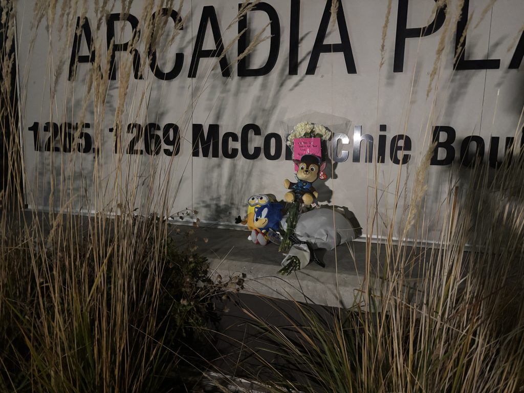A small memorial set up for a 5-year-old boy who was killed outside Arcadia Place on McConachie Boulevard near 62 Street on Monday morning. (Photo Credit: Siddi Chudal, CityNews)