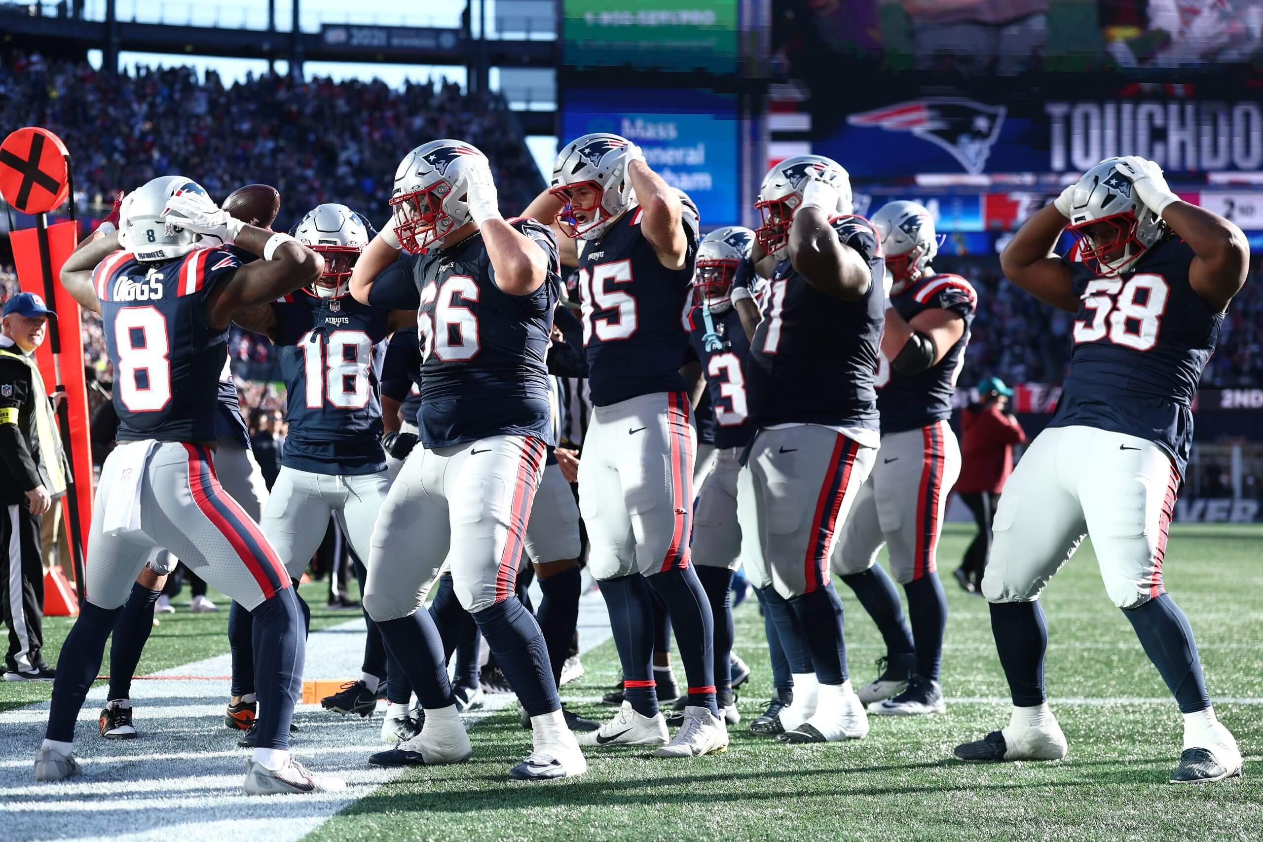 Stefon Diggs leads a pre-rehearsed touchdown celebration during the Patriots’ win over the Falcons on Sunday. (Maddie Meyer / Getty Images)